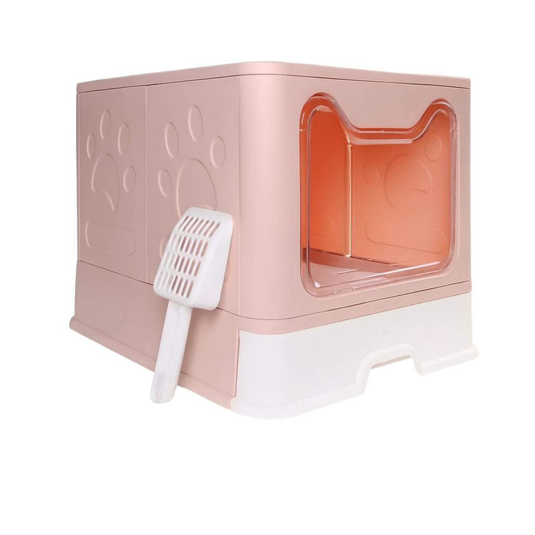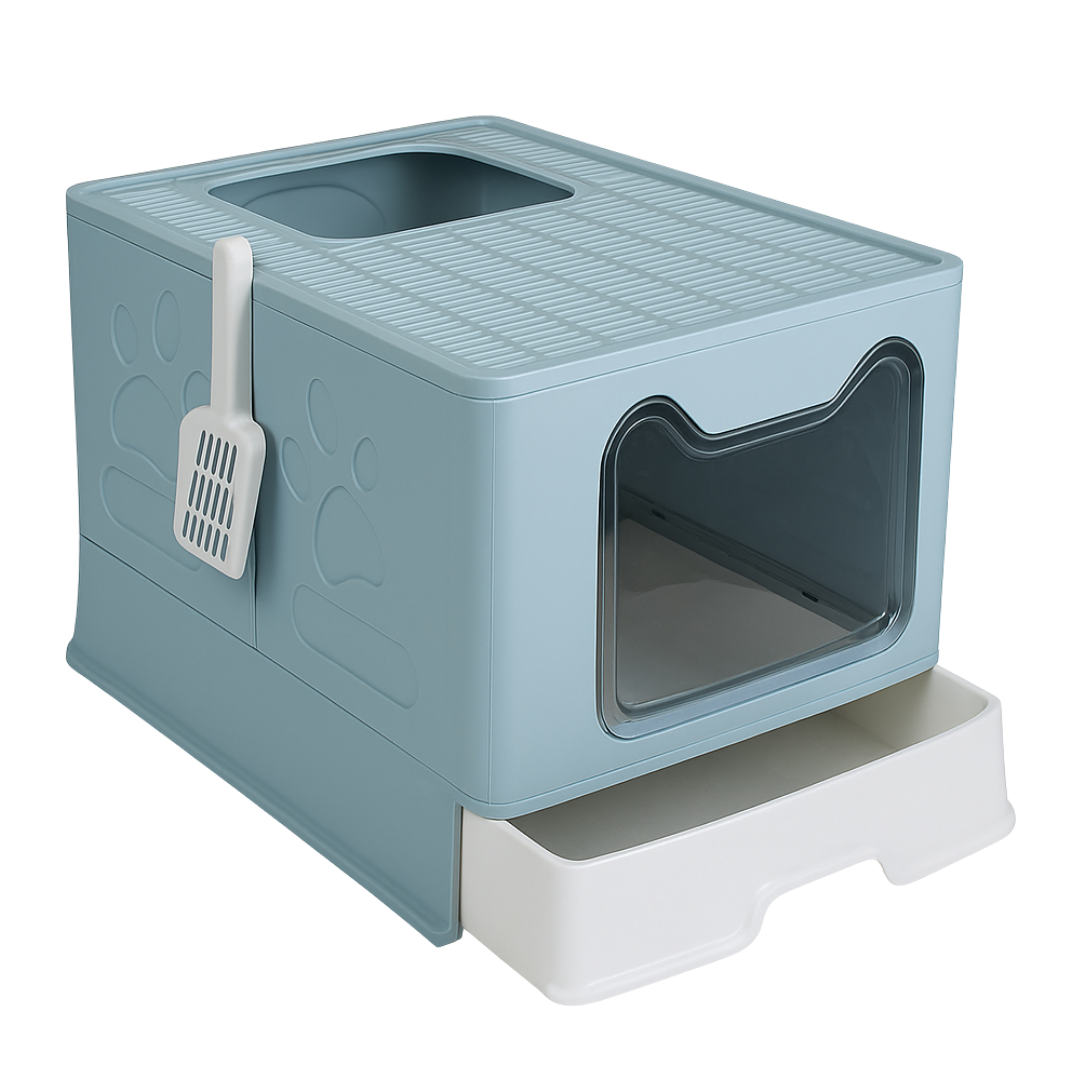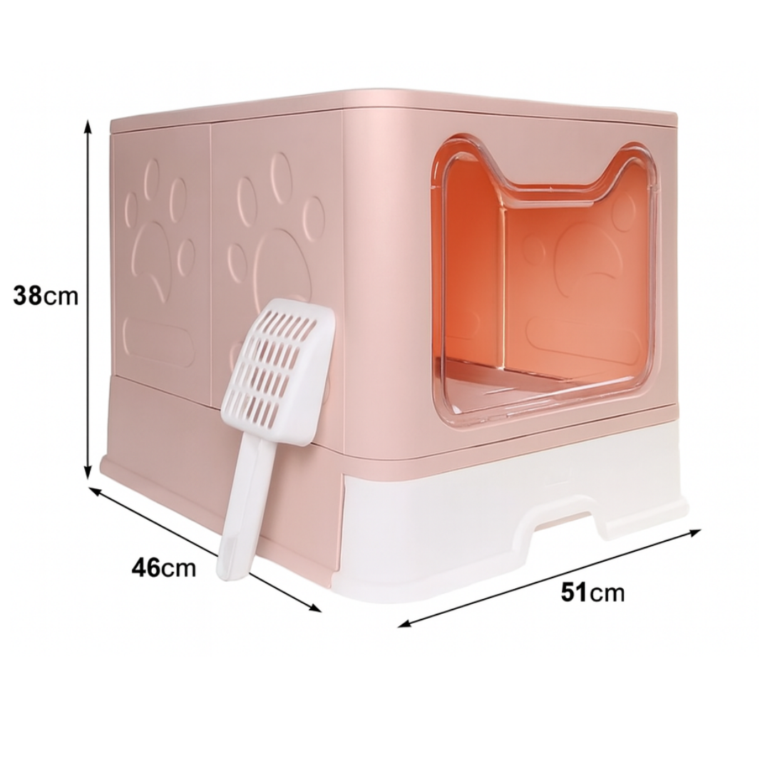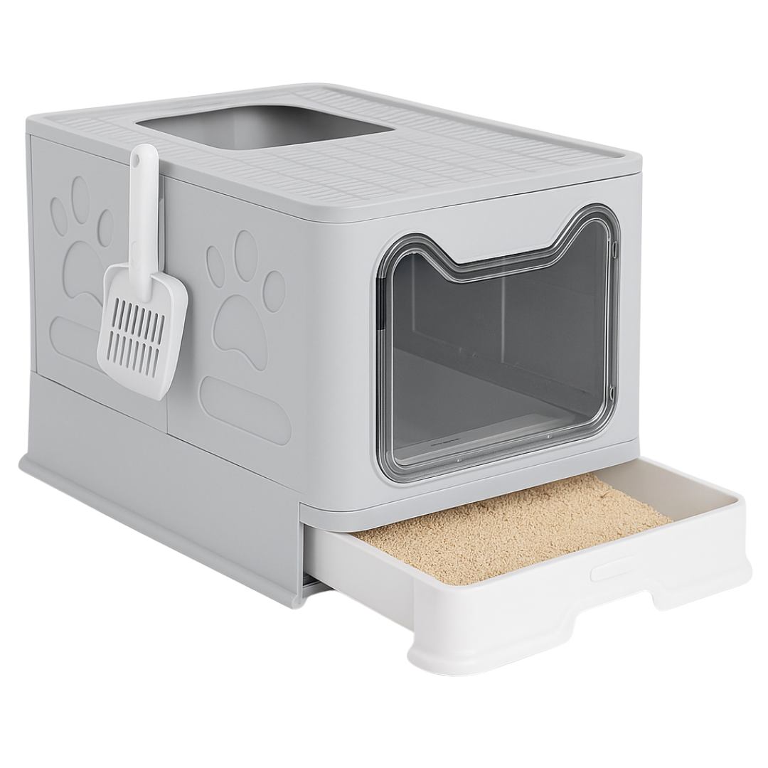 Beneficios: El arenero cerrado para gatos es una solución práctica e higiénica que mantiene el hogar limpio y libre de olores. Su diseño moderno en gris claro con puerta transparente brinda privacidad, mientras que la bandeja deslizable facilita la limpieza. Incluye pala lateral y una entrada superior antidesperdicio que evita la dispersión de arena.