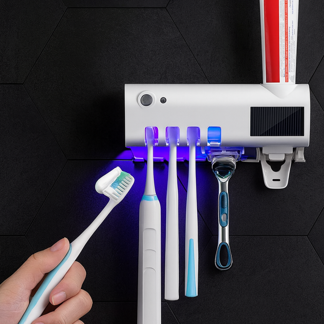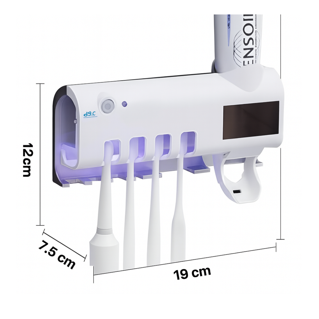 Beneficios: Organiza y desinfecta tus cepillos con este práctico dispensador de pared con luz UV, capaz de eliminar bacterias mientras mantiene el baño ordenado. Incluye porta cepillos para hasta 5 unidades, dispensador automático de pasta dental y un diseño compacto y elegante de fácil instalación.