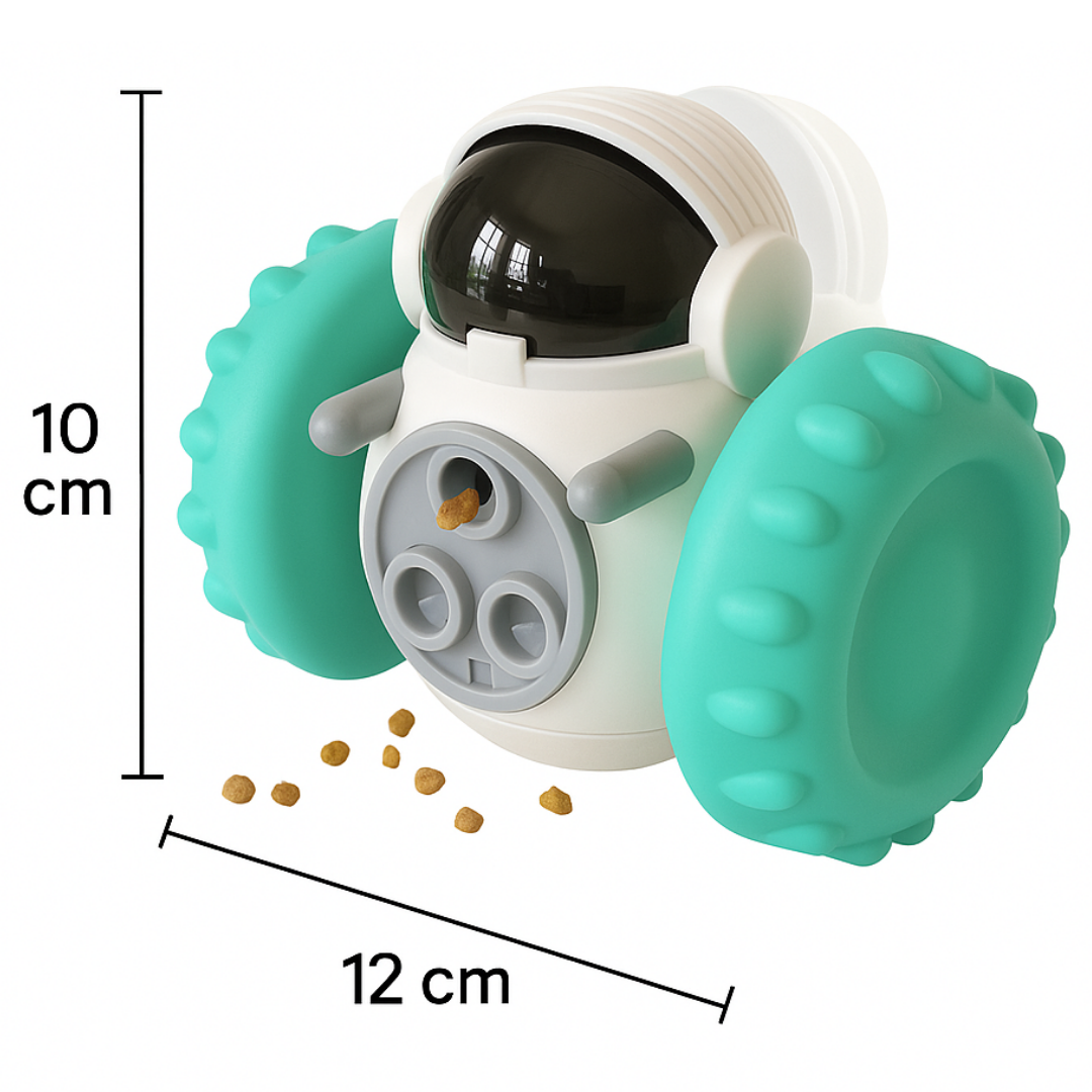 Beneficios: Divertido dispensador en forma de astronauta que estimula la actividad física y mental de tu perro o gato. Con ruedas de goma resistentes y seguras para morder, visor brillante y compartimento central para snacks, está fabricado en material no tóxico, duradero y fácil de limpiar.