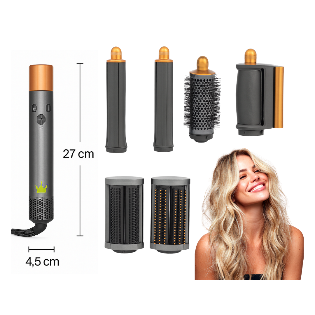 Beneficios: Este estilizador multifuncional 5 en 1 permite alisar, rizar, dar volumen y secar el cabello con un solo equipo. Sus accesorios intercambiables ofrecen resultados profesionales desde casa, cuidando el cabello gracias a su tecnología que distribuye el calor de manera uniforme. Su diseño moderno y práctico lo convierte en la herramienta ideal para lograr peinados rápidos, definidos y con acabado de salón.