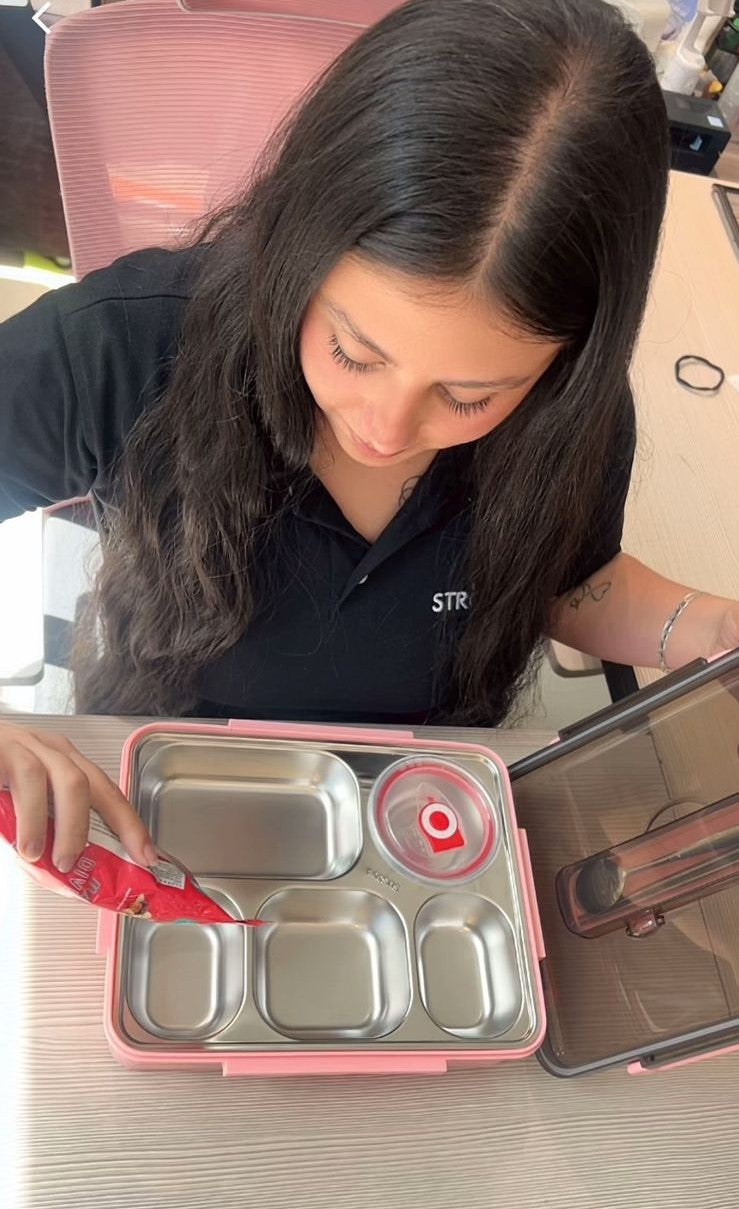 Beneficios: Práctica y resistente lonchera con base de plástico reforzado e interior de acero inoxidable fácil de limpiar. Cuenta con 4 compartimentos individuales que mantienen los alimentos separados, frescos y con mejor sabor. Su diseño incluye tapa hermética con cierre seguro, lo que la hace ideal para uso escolar, laboral o viajes. Reutilizable, duradera y muy práctica para llevar comidas completas de forma organizada.