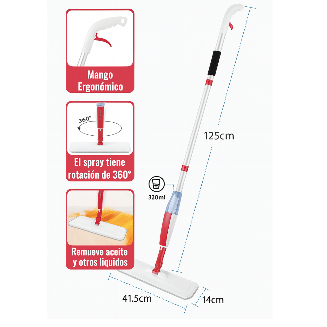 Beneficios: Práctica y ligera mopa con depósito recargable de líquidos de limpieza, diseñada para eliminar polvo, manchas, aceite y otros líquidos sin necesidad de baldes. Su mango ergonómico y spray con rotación de 360° facilitan llegar a cada rincón, siendo ideal para todo tipo de pisos.